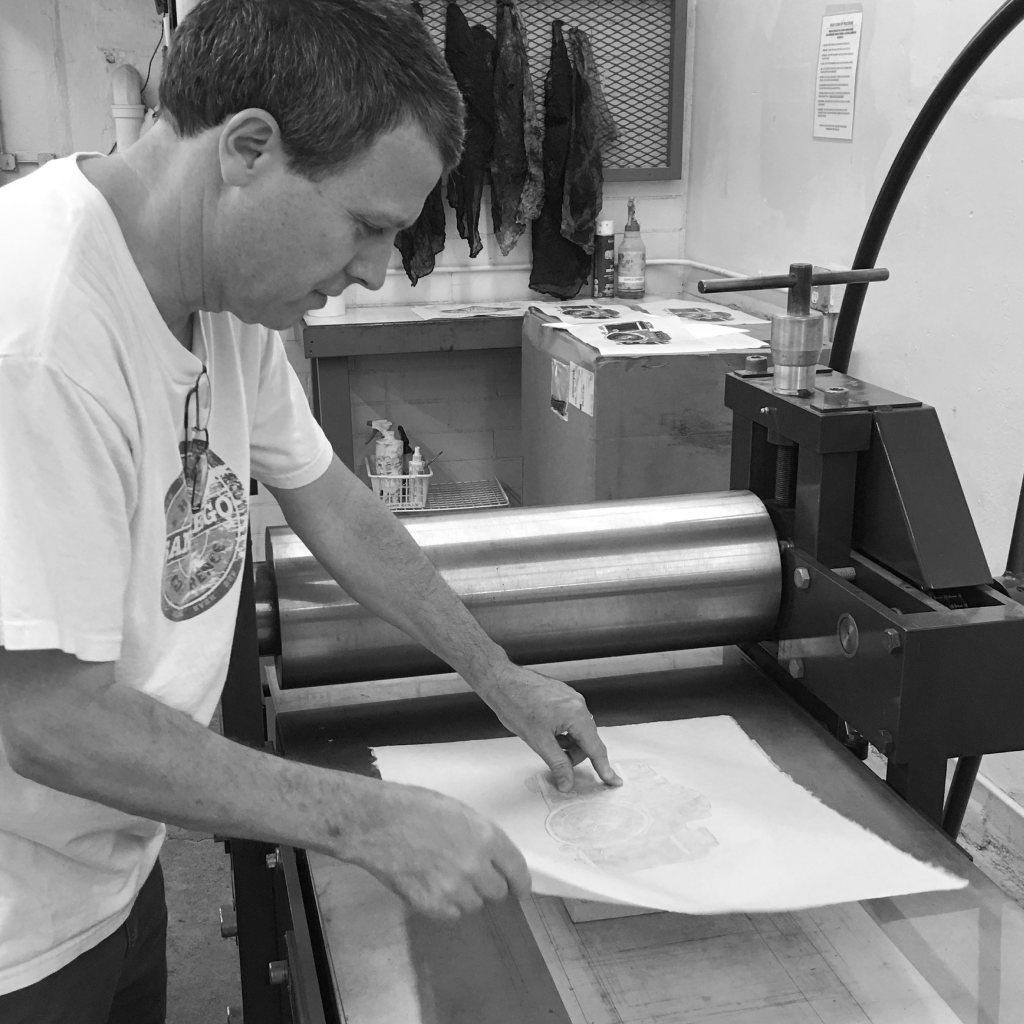 We began our printmaking journey in Brazil in the 1990s, primarily working with lithography. After moving to Austin in 2013, we shifted our focus to etching and aquatint—you can explore some of this work on our Fine Art Prints page. More recently, we’ve been dedicated to linocut (relief) designs for our t-shirts.
