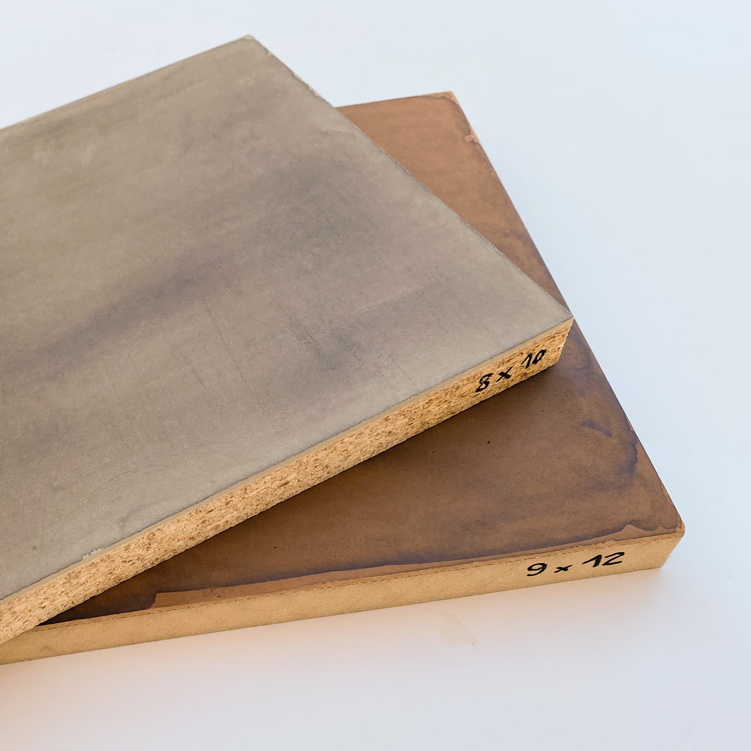 The block comes in two colors (brown and gray) and various sizes. For t-shirts, we typically use 8 x 10" or 9 x 12" sizes. Before starting the carving, we apply a layer of black ink, which helps the carved areas stand out more clearly.