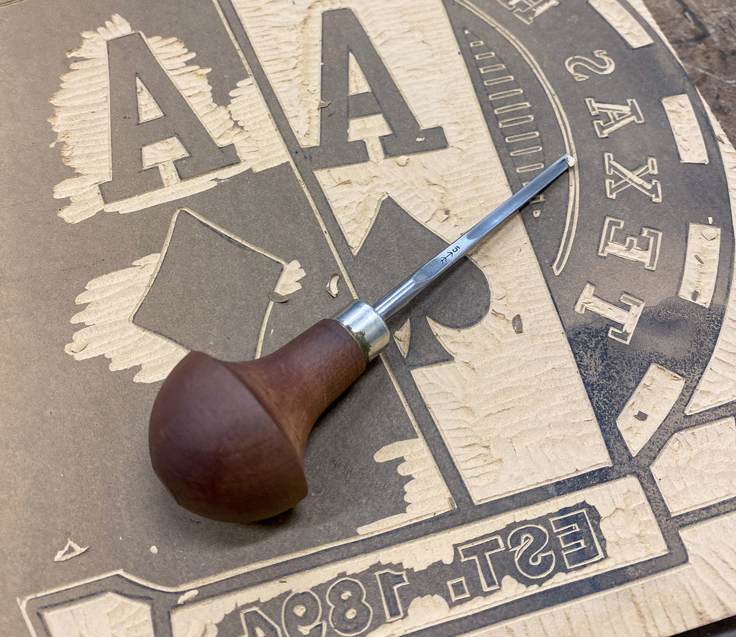 Before starting the carving, we first decide on the design. We typically begin with paper sketches and then explore additional ideas on the computer. Then we print the final image on the right size reversed
