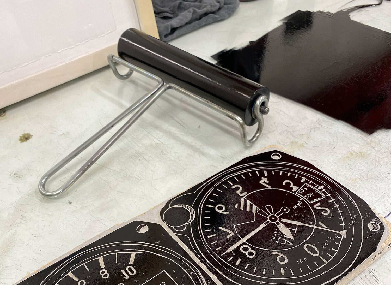Once the carving is done, we prepare the ink, then roll the brayer over it and transfer it to the block as many times as needed until the block has the right amount of ink.