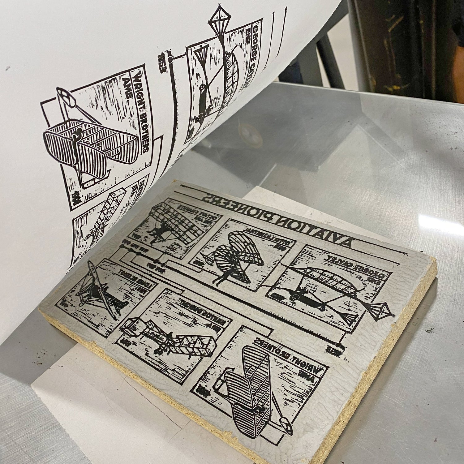 Once we feel confident that we're close to the final version, we run the block through the press to print a proof on paper and assess where we stand. Usually, some further carving is needed after the proof.